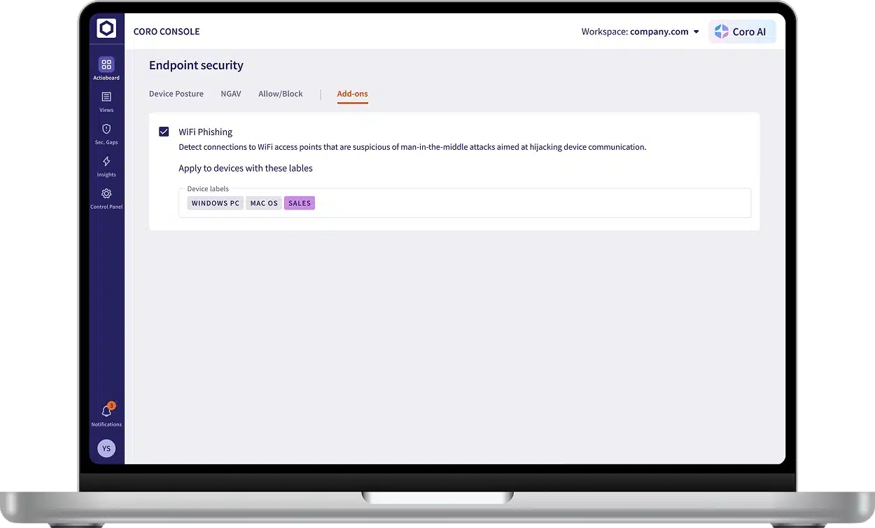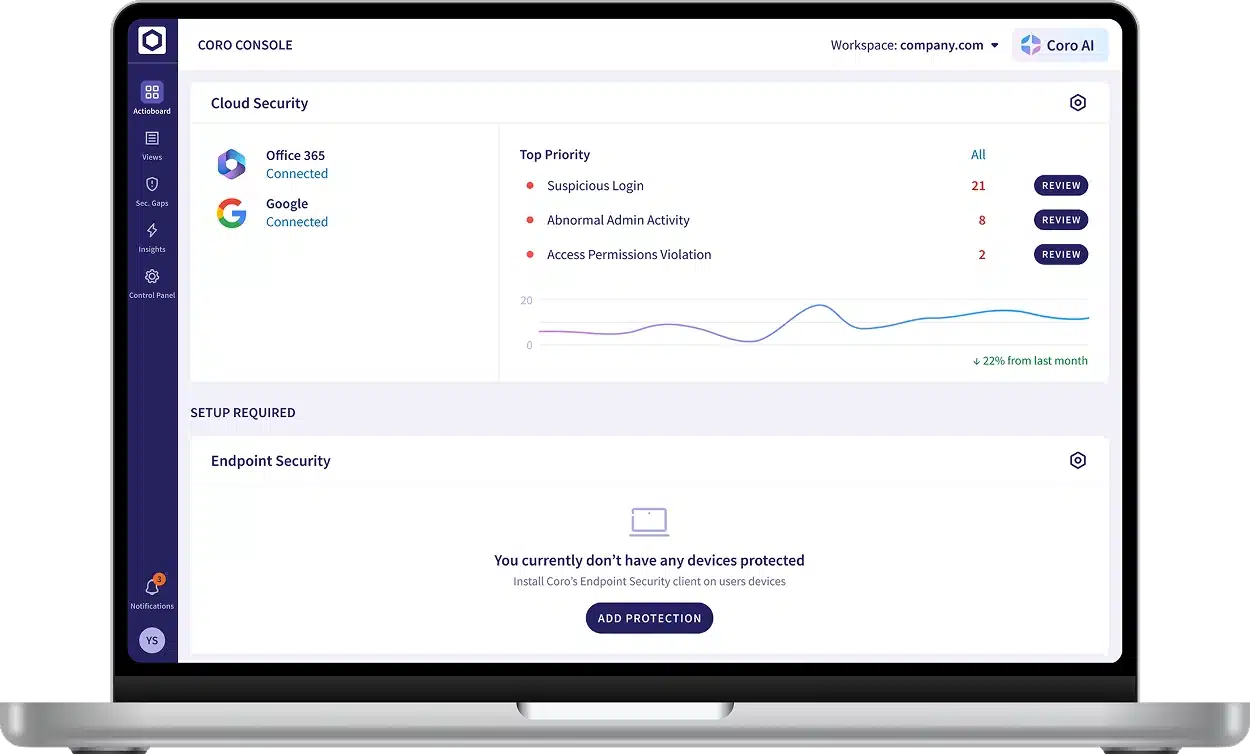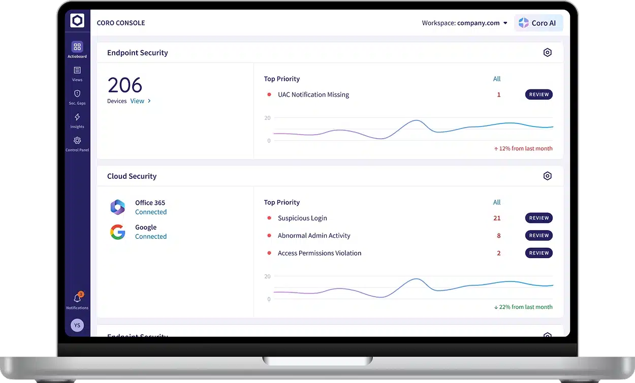 Safeguard endpoint devices and protect your business with the Coro Endpoint Security module. It automatically identifies and logs all devices, scanning for malware, suspicious activity, and human errors. The Endpoint Security module detects unusual behavior and neutralizes threats before they can cause harm.