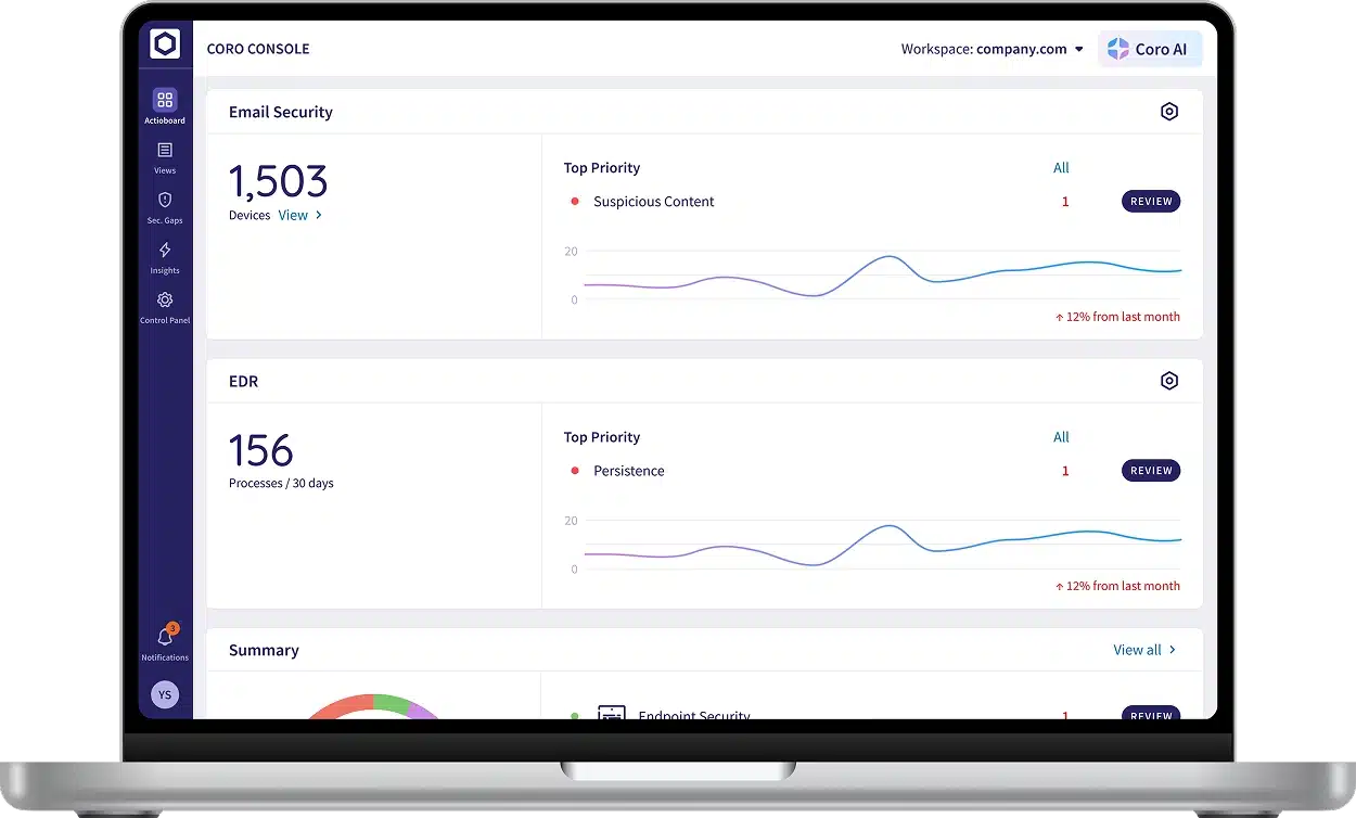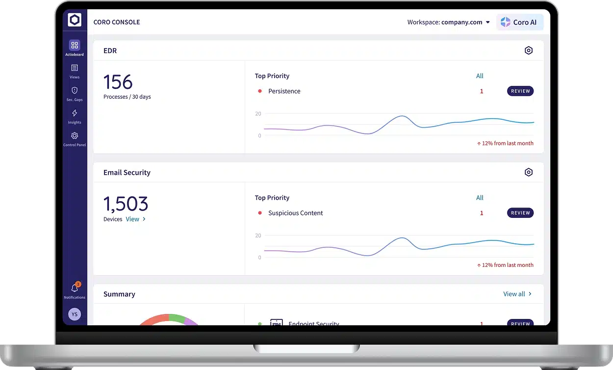 Coro's Endpoint Detection & Response (EDR) module provides proactive, real-time protection for interconnected endpoint devices and the broader network against sophisticated cyber threats. Leveraging behavior-based detection and continuous monitoring, Coro EDR identifies threats in real-time, preventing them from going unnoticed for extended periods.