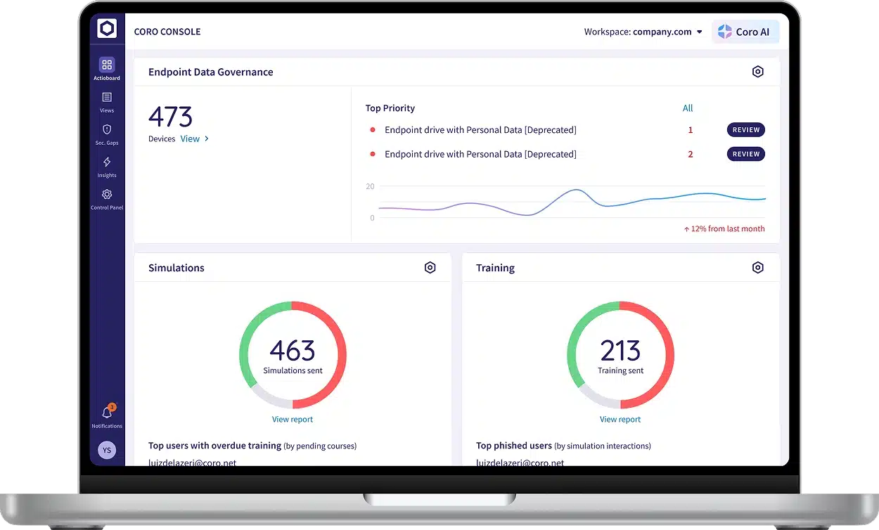 Coro’s Security Awareness Training (SAT) module empowers leadership, employees and contractors with the knowledge and tools to recognize phishing and social engineering attacks. SAT reduces human error and strengthens your cybersecurity posture through real-world phishing simulations and high-quality security awareness training. Using SAT shows that your business has proactively implemented security awareness measures, mitigating legal, financial, insurance, and reputational risks while safeguarding your organization and leadership.