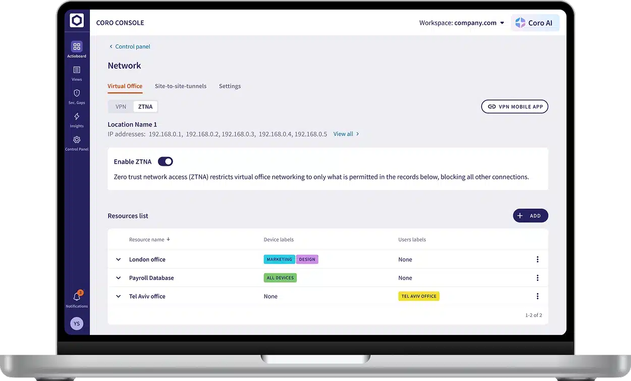 Coro's Network module is built for distributed and remote workforces and enables organizations to create a secure virtual office, protecting against external and internal threats. It secures computer networks, and the data transmitted across them by offering a choice of enterprise and military grade encryption VPN and Zero Trust Network Access (ZTNA). These advanced defenses replace traditional firewalls, providing superior protection without the complexity of hardware installation or the need for large IT teams.