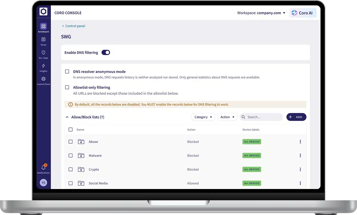 The Secure Web Gateway (SWG) lets you apply DNS filtering to restrict network traffic. DNS filtering can protect your business from malware, viruses, and other potential threats.