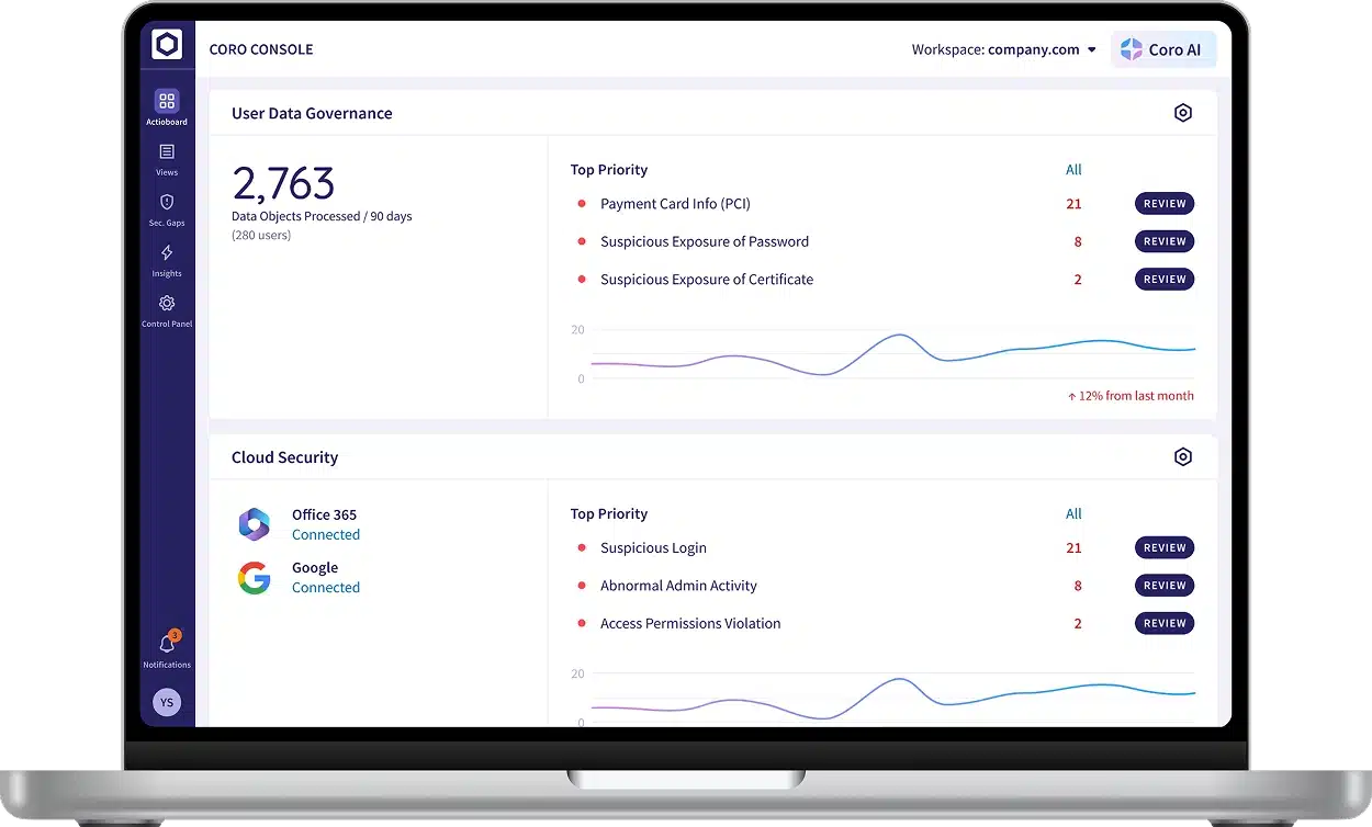 The Coro User Data Governance module enables businesses to detect unauthorized sharing or access of sensitive data. Through continuous monitoring of user behavior and data exposure, it ensures that sensitive data such as personal details, health records, and payment information is only accessible to authorized individuals and compliant with data protection regulations such as GDPR, HIPAA, and PCI-DSS.