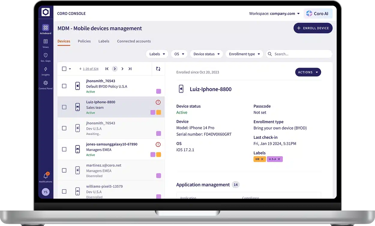 Coro's Mobile Device Management (MDM) module simplifies the management and security of company-owned and Bring Your Own Device (BYOD) work-related mobile devices. It enables IT teams to enforce app policies, manage apps, and ensure company policy compliance. The module gives visibility into mobile devices, ensuring efficient device management across the organization.