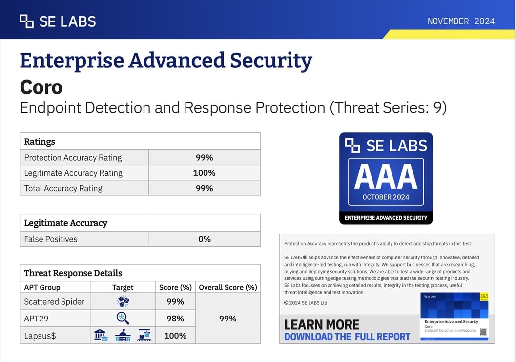 Coro EDR Achieves Near-Perfect AAA Rating in SE Labs Advanced Enterprise Security Protection Test. In the latest Enterprise Advanced Security evaluation by SE Labs, Coro EDR demonstrated elite-level performance, achieving a 99% Total Accuracy Rating. The report highlights Coro’s ability to detect and protect against sophisticated, real-world attack chains, modelled after notorious threat groups like Scattered Spider and APT29, while maintaining a 100% Legitimate Accuracy Rating with zero false positives.